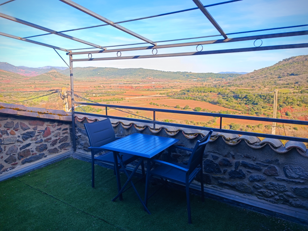 On y trouve une jolie vue sur les paysages rouges ocre des alentours du Salagou.